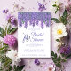 Samla under visteria vinodlingar i vår för en vacker trädgård, möhippa. Ett vackert, flerdimensionellt kant av vild lila-vindruvor överst. En söt vattenfärgscykelgrafik till lämnad, nära mitten, anpassade text. På baksidan är ett vitt ram för registerinformationen på en lila bakgrund med vita prickar. Originalgrafik från Kredit till Vecteezy.com