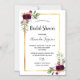 På framsidan: En vit bakgrund med faux guld ram. Dekorerad med mörk burgundblommor, ro, boho stil-fjädrar och grönska. Anpassa och lägg till bridens namn för att vara och närmare party. Kan också användas som ett sätt att spara datumpåminnelsen för gästerna.