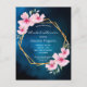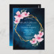 En inbjudan till möhippa om tropisk sommartid från elegant. Med ett faux guld geometric ram dekorerat med rosa hibiscus, blommor tropiska blommigtar med en viss grad av grönenergi. En mörk blått tropisk natt himlar som bakgrund. Texten: Möhippan och briden som ska vara namn är skrivna med ett modernt, hanterat stil-skript. Vit text. Baksida: blå natten himlar som bakgrund.