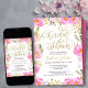Flora Inbjudningskort för möhippan med elegantens kalligrafi. Den här feminin vattenfärgen har blommor från rosa och guld, ett grönt streck och några rosa färgstänk. "Möhippa" skrivs ut för hand i guld på ett snabbt sätt och du kan anpassa resten av inbjudningsformuleringen med hjälp av mallen.