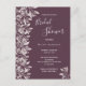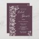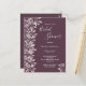 Ett trendig botaniskt Inbjudningskort för möhippan i kassis, djup lila. Dekorerad med dammig löv och sprit från ro färgad. Modern text med stora bokstäver, typografi med texten: Möhippa. Mallar för briden som ska vara namn och party. Vit text. Bakåt: färgadens bakgrund för chassit. Tips! Om du inte vill att det ska se ut som ett vykort klickar du på anpassa, går till baksidan och tar bort delaren och lägger till frimärke.