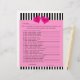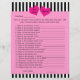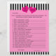 Den här roligtens möhippa eller spel för möhippa gör ett underbart tillägg till en möhippa eller möhippa. Utformningen har svart och vitt rand som bakgrund med två rosa hjärtan högst upp. Ett hjärta säger "Vem vet" och det andra hjärtat säger namn i bruden (som du kan anpassa) på designen. Det finns en ställe för gästen namn i party, spelinstruktioner och 20 frågor om bruden. Tanken är att se vem som vet mest om bruden med den person som får mest poäng för att vinna spelet. Det underbara sak om det här möhippan är att du kan anpassa det med namn på bruden och anpassa det med bridens färg som bakgrund för frågorna...Om du vill göra det klickar du bara på Redigera och väljer en bakgrund färg. Den här möhippan är papper för att du ska kunna leta efter en möhippa, men den finns även i andra . En roligt och ett unikt speltillägg till möhippan. Copyright henishouseofpaper