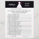 Den här möhippan av roligt eller möhippa är en perfekt som söker efter en möhippa. Med en svart bakgrund med en möhippa på rosa ros överst på designen kan designen vara personlig för din brud med namn till lämnat om möhippan och "Möhippan" i ord till högerna av möhippan. Det här spelet innehåller 20 frågor till möhippan eller möhippans gäster att besvara om bruden. Det finns en plats i grund för att summera det totala poängtalet och du gissade det...Den som har flest poäng vinner spelet. Utformningen visas på ett fint vitt streck som är pappert för att göra en perfekt till en möhippa. Ett spel för roligt och underbar möhippa eller möhippa. Copyright henishouseofpaper
