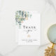 En modern och elegant möhippa tack vare ditt kort. En vit chic bakgrund. Dekorerad med grönt vattenfärgade eukalyptus löv, sprickor, grön och faux golden sprigs. Svart text. På framsidan står texten: Tack, namn och ett datum. Tillbaka: Mall för tackkort och namn.