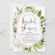 Eucalyptus Greenery Botanical Watercolor och Ro Guld - Rosa Geometric Vår bröllop Inbjudningskort för möhippa på vit bakgrund - innehåller vacker och elegant manustypografi med modernt botaniskt löv och grön för speciella Briden att vara firande.