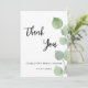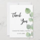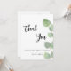 Ett tack för en Möhippa. En chic vit bakgrund som dekorerats med eukalyptus greenery. På framsidan har stora svarta färgader skrivit skript och texten: Tack, ditt och ett datum. Tillbaka: Anpassa och lägg till tackkort och namn.
