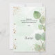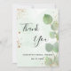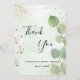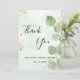 En Möhippa tack. En grönt vattenfärgad bakgrund som dekoreras med eucalyptus greenery och faux guld glitter stoft. På framsidan skriver stora svarta färgader skript och text: Tack, text, rubrik och datum. Tillbaka: Anpassa och lägg till tackkort och namn.