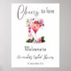 Elegant Garden Flowers with Glass of Champagne, Berries and text "Cheers to Kärlek" Blommigt themed Möhippa Välkomstskylt in lilac, lavender, rosa, persikor, aprikoser och grönt färg.