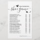 Bröllop-spelkort | Möhippa och pars stöttspel Game Få skrattet att rulla mot firande med vårt Bröllop-skokort | Möhippa & Couples Shower Guessing Game - ett roligt, interaktivt sätt att underhålla gäster och visa hur väl bruden och brudgummen känner varandra. Designad med minimalistisk elegans, vattenfärgade blommigtar som tillval och ren modern typografi, är detta spel ett måste för dina bröllop-evenemang. Perfekt för möhippor, pars duschar, möhippor eller till och med repetitionsmiddagar, det här kortet innehåller lekfulla uppmaningar som "Vem sa att jag kärlek först?" eller "Vem är bäst på att laga mat?" som får paret att höja sina skor (eller skyltar) som svar. Det är ett underbart sätt att utlösa skratt, vänskapliga debatter och minnesvärda stunder med dina gäster. Anpassa med parets namn, händelsemedatum eller personliga beröringspunkter för att matcha ditt bröllop-tema - oavsett om det är rustiskt, minimalistiskt, elegant eller boho-chic. Utformningen parar på ett vackert sätt med vad hon sade, att hon trivialiserar möhippan eller triumferar spel för en komplett uppsättning möhippor. Det här spelkortet är underbart för bord-inställningar, aktivitetspaket eller partiförmånspaket. Den är också tillgänglig som utskrift för virtuellt eller hybridt firande. 🖤 Klicka på Anpassa nu om du vill skapa ditt Bröllop Shoe Game Card och låta skrattet börja! bröllop-skokortet kan skrivas ut, möhippa-skon-spel, minimalistiskt par duschspel, brudens sida-gissningsspel, elegant möhippa-aktivitet, sa att hon sa att spel, möhippa-spelfrågor, brud- och groom-trivia, möhippa brunch-spelkort, vattenfärgsgissningsspel bröllop
