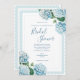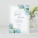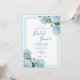 Fina blå och vita vattenfärgsliknande vattenfärgsgrafik som förskönar varje hörn av detta vackra inbjudningskort för möhippan. Perfekt inramad med en vit skalad kant. Samordningen av typsnitt bidrar till att göra denna utformning ännu mer vacker.