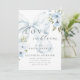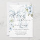 Fira bruden som ska vara med eleganten "Kärlek in Bloom" inbjudningskort för möhippan. Den här inbjudan innehåller en delikat vattenfärgsdesign i mjuka blå blommigtar och innehåller charm och sofistikering. En strålande blå båge och elegant manustypografi tillför en romantisk beröring, skapar den perfekten för en trädgårdshandlad möhippa party, vår eller blommigt.