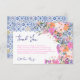 Tack vare det här kortet kan du visa charm och elegans med den inspirerade utformningen mellan Italien och Medelhavsområdet. Den övre och den grund gräns är adorberad med ett intensivt blått keramiskt mönster, som påminner om en kuststad som ligger i sol, medan den handmålade rosan och de orange vilda blommorna tillför ett levande, romantiskt flage. Det känsliga manuset "Tack" överst är både modernt och hjärtligt, och skapar det vara ett perfekt sätt att uttrycka tacksamhet till dina gäster. Kortet är fullt anpassade, vilket gör att du kan anpassa meddelandet så att det passar tillfälle, skapar det som ett idealiskt val för alla händelser från bröllop till möhippor.