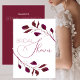 Vänner och familj i inbjudan för att hedra skon med eleganten, Watercolor Blommigt Inbjudningskort för möhippan. Framsidan är designad med fet löv av tranbär på en vit bakgrund med text: Möhippa. Omvänt är designat på en kranärröd bakgrund med fullständiga uppgifter om inbjudan, inklusive datum, tid, plats, osa och register över möhippor. Om du vill anpassa dig ersätter du bara exempeltexten med vår enkla mall och ersätter exemplet.