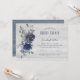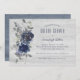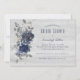 Vattenfärgerna grått och marinblått silver blommigt gräns på lämnat, med mallar för personlig möhippa på höger i marinblått. Silver grått-träskikt på vit bakgrund på framsidan och dammblått på baksidan.