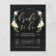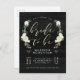 Elegant blommigt inbjudningskort för möhippa med texten "brud to be" i ett handskrivet typsnitt med peonier, ro och löv där guld foil löv bildar en krans runt den på en vattenfärgad bakgrund av mörken. Perfekt för möhippor i vår-trädgården.