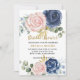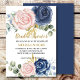 Elegant och chic inbjudningskort för möhippan med marinblå och blommigtar för rosa som bakgrund, elegant romantisk med minimala layoutfunktioner. Anpassade, redigera typsnitt, ändra bakgrunden till färg, ändra ordalydelsen så att den blir unik. Besök marinblå och rosa samling för allt du behöver för att skapa en första klasshändelse. Inbjudningar, blöjor, tallrikar, välkomstskylt, tackkort, favoritbox, godis-omslagsetikett med mera.
