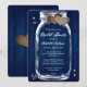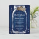Rustic navy blue inbjudningskort för möhippan med en mason burk med två burlap-hjärtan och baby utandningsblommor på en lada-träbakgrund. Matchande objekt är tillgängliga.