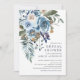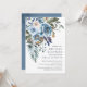 Fina blåfärgade blommor blommigt inbjudningskort för möhippan satte på en skarp vit bakgrund. Vänd över möhippan inbjudan om du vill visa en koordinerande blå vattenfärg för en speciell beröring i extra