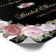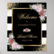 Elegant Black and guld blommigt möhippa-välkomstskylt med blommor i rosa och grönt inramning av händelseinformationen i guld ram, med guld konetti som täckt med svart och vit strimlad bakgrund. Matchande objekt är tillgängliga.