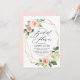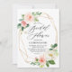 Geometric Guld Ram Rosa Peach Watercolor Blommigt Inbjudningskort för möhippan. Anpassade inbjudningskort för möhippan med vattenfärgsromantisk rosa och vita blombuketter med grön och faux guld foil geometric ramar. Blommigten inbjudningskort för möhippan är perfekt för möhippor i vår och trädgård.