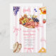 Möhippa med kartonger och bogar med illustration av en karosseri omgiven av rosa bows, frukt, ost, bröd och honung. Bakgrunden är rosa rand.