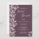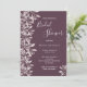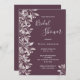 Ett trendig botaniskt Inbjudningskort för möhippan i kassis, djup lila. Dekorerad med dammig löv och sprit från ro färgad. Modern text med stora bokstäver, typografi med texten: Möhippa. Mallar för dina första uppgifter om namn och bröllop. Vit text. Bakåt: färgadens bakgrund för chassit.