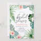 Eleganten inbjudningskort för möhippan har en vit bakgrund med tropiska blommor och löv som hibiscus, monstera och handflatan träd löv i vattenfärg. Anpassa den efter dina behov. Du hittar matchande produkter i min butik.