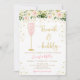 Eleganten inbjudningskort för möhippan har vattenfärgblommor i rosa med faux guld foil konetti och ett rosa- och guld champagneglas med guld bubblor.