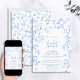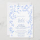 Modern, elegant inbjudningskort för möhippan med en kaskad av ömtåliga, blå blommigt botaniska ämnen. Anpassa din möhippa i samordning med blått, accentuerad med vacker, modern, skriftlig kalligrafi. Copyright Anastasia Surridge for Elegant Inbjudningskort, alla höger förbehållna.