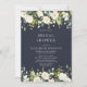 Denna vackra, romantiska vita blommigt, grön vattenfärg inbjudningskort för möhippan, har en kraftig grönaktig droppe överst som består av en kraftig samling av eukalyptus greenery och vit ros, vattenväxter och andra vita blommor. En liknande arrangemang placeras grund i formgivningen, och elegant i den moderna inbjudningstexten från stil anpassas till formgivningen i mitten, med vit elegant på en modern marin blå struktur. Copyright Elegant Inbjudan, alla höger reserverade.