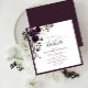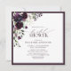 Modern, elegant2 inbjudningskort för möhippan med en blommigt bukett av mjukt, vattenfärgat ro i plommonskuggor av lila, med eukalyptus botaniska löv av lush grönt och gränsad till plommonlila. Anpassa din möhippa, accentuerad med vacker, modernt, skriftlig kalligrafi. Kortets baksida är en passande lila för plommon. Inbjudningskort för Elegant av upphovsrätt, alla höger reserverade.