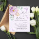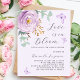 En mjuk bakgrund för lilac-färgad. Dekorerad med en lera och lila ro och grönt vattenfärgad eukalyptus greenery och butterflies. Anpassa och lägg till ditt namn och information om party. Text: Kärlek är i Bloom. 1 lakan = 1 inbjudan tryckt kant till kant.
