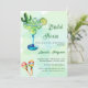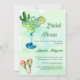 En vattenfärgad bakgrund med grönt som dekoreras med vattenfärgade kaktus, en stor grönt och blått glas med en margeritakosvans, färglösa maracas Personalize och namn på bruden som ska vara och detaljer.