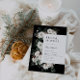 Vi presenterar vår häpnadsväckande moody vinter-blommigt inbjudningskort för möhippan, med en vacker blommigt ram som består av buketter med vit ros och vintergröna, gräs-koner och eukalyptus på svart bakgrund. Denna inbjudan till elegant är perfekten till att inbjudan era gäster att fira det kommande bröllop med den blivande bruden. Den känsliga vit ros symboliserar renhet och nystart, medan vintergröna, gräs-koner och eukalyptus tillför en aning naturskönhet och värme till utformningen. Kombinationen av dessa inslag skapar en verkligt magisk vinter under jord som säkert imponerar på dina gäster. Den här inbjudan är perfekt för en vintermöhippa, med dess elegant och tidlös utformning. Det kommer att glädja gästerna att få en så vacker inbjudan, och det är säkert att tonen läggs på ett minnesvärt och speciellt firande.