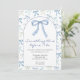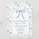 Den här inbjudan innehåller en mönster av blå vattenfärgsfärgade färgband för en "något blått före jag"-temat möhippa.