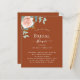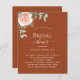 Bränd bakgrund till orange. Dekorerad med en blommigt för guld och rosa, blomma från ro och grönt, vattenfärgad eukalyptus löv, sprig, grönsak och faux ro sprig. Anpassa och lägg till bridens namn för att vara och närmare party. 1 lakan = 1 inbjudan tryckt kant till kant.