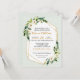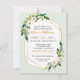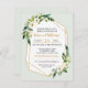 Ett guld-folie ser geometriskt ut ram med grönt och vitt blommigt vattenfärgade bouquethörn ställs in mot en ljusakvatisk bakgrund. Gör ett vackert modernt påstående för en utomhusmöhippa eller möhippa eller en som är grön med beröring av guld. Tillgängligt med matchande produkter.