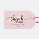 Dessa vänteletaggar för möhippan "tack" för rosan är perfekt för en elegant bröllop-dusch. Utformningen har ett romantiskt och sött, flytande, kursivt teckensnitt på en vacker och känslig bakgrund för rosa av ballett. Anpassa dessa favoritetiketter med bridens namn och möhippans datum.