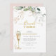 Skönhet och roligt med den här bruch- och bubbelfärgade Möhippan champagne-luncheon-inbjudan designad med viskpigt mjuk eukalyptus grenar-gyldade guld-löv och en rosa baksida på baksidan av kortet. Anpassa enkelt med briden till namn och annan viktig information.
