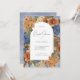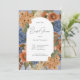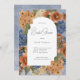 Den här enkla men elegant inbjudningskort för möhippan-designen har ett vackert sortiment av vattenfärgsvätskor och andra blommor av dammiga periwinkle blues, light and mörk rust, och grädde med grönt. Texten visas på en vit båge. Bakgrunden är en mjuk, dammig, vinkelblått som är pressad med vitt. Skapat av Farmhouse Press.