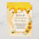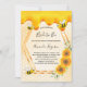 Elegant, roligt, rustik sommar inbjudningskort för möhippan. Gultens bakgrund med en bikaka mönster. Med faux guld geometric ram och söt honungsdroppning. Dekorerad med solblommor av gult och orange och lycklig humla. Med texten: Bride to Bee och namn i bruden på framsidan skriven med ett modernt handskript skrivet stil. Black brev. Tillbaka: gult honeycomb mönster, honungsdroppar och ett bi.