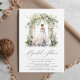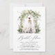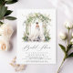Elegant Inbjudningskort för möhippan har kalligrafskript möhippa i handskrivet trendig, vattenfärgsbåge grind med blommor, grönt löv och brud i bröllop. Anpassa med namn och detaljer.