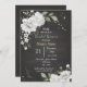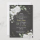 Drömlig romantisk vit blomma och grönt löv botaniskt svart inbjudningskort för möhippan. glitter-uppgifterna simuleras