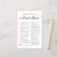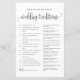 Lägg till den här roligten och spela Bröllop Traditions-spelet till evenemanget. Den har ett svart, vismiskt skript, klassisk typografi och rosa. Du kan anpassa baksidan av det här möhippans spelkort. Det här gissningskortet är perfekt för alla teman och möhippor.