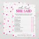 Detta moderna bingospel har en rosa magenta bakgrund med metallisk konfetti. Texten är skriven i en blandning av ett lekfullt kalligrafi-teckensnitt och ett modernt serif-teckensnitt, detta kort är personligt med Brudens namn och Bröllopsfestens datum.