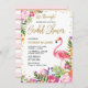 Vackra tropiska inbjudningskort för möhippan med vattenfärgad illustration av rosa flamingo, vibrerande blommor och faux guld-bokstäver. anpassadets inbjudan är perfekt för sommartid/tropisk/Hawaiisk/luau-temamöhippa.