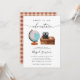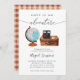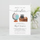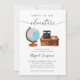 Tema för resor, inbjudningskort för möhippan, med illustration av vintagens resväska, kamera och en glob. I texten står det "kärlek är ett äventyr".