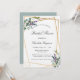 En vit snyggt på framsidan. Dekorerad med eukalyptus och lavender- blommigtar. Ett faux guld geometric ram. Anpassa och lägg till namn och detaljer. Bakåt: grönt grått färgad bakgrund.