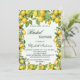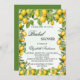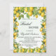 En grönt vattenfärgad bakgrund. Dekorerad med citroner av gult och grönt. Anpassa och lägg till information om namn och party. Namn är skrivet med ett handskript i stil. Bakåt: gröntens bakgrund