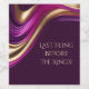 Förhöj din sista fling med konstnärlig flair med dessa moderna etiketter för vinflaskor, med fängslande lila, rosa och guld design med budskapet "Sista flingen före ringen!" Beställ dessa unika vinetiketter idag och gör din händelse minnesvärd med konstnärlig flair och sofistikation.